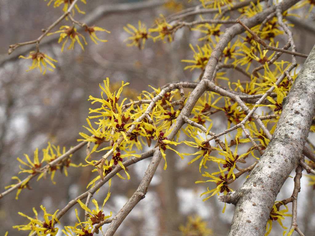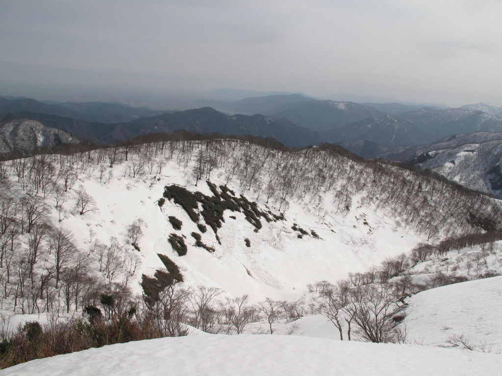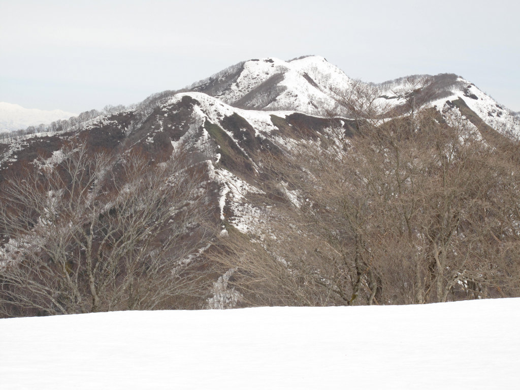 小津の体育館に駐車し、白山神社横の登山口から上る。スギ花粉症がひどいので、植林地はマスクをして上る。そうでなくても汗かきなのに、マスクをしながら上ると余計に汗をかく。杉谷林道終点からは自然林に変わるのでマスクを取る。マンサクの黄色い花が咲いており、春の訪れを感じさせてくれる。高屋山までは地元の人も上ってきているようで枝がはらわれていた。雪はしっかり残っており、忘れたころに登山道が見え隠れする程度だ。前衛峰をすぎた下りの日陰の急斜面が凍っている。慎重に下ったのだが、すべってしまい落ちていく、スピードが出てきてしまったので木にしがみつき事なきをえた。