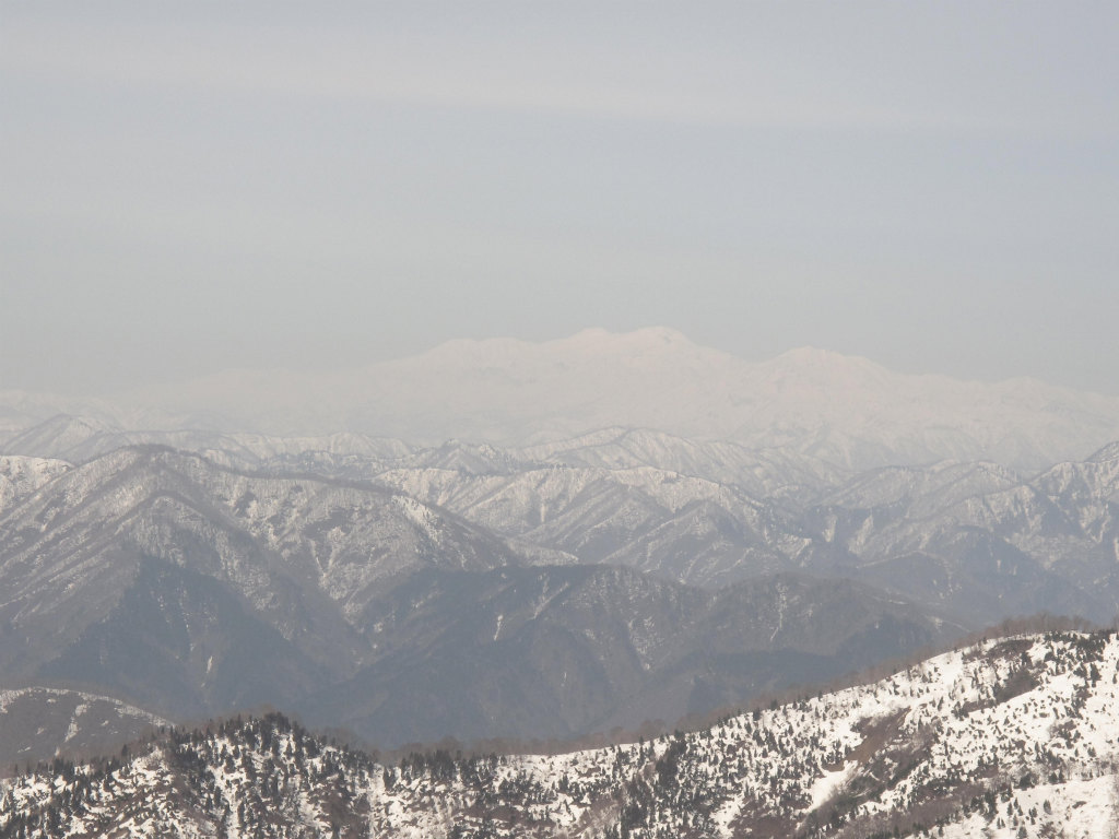 ひと上りすると小津権現山の頂上で、祠がある。祠は台の上に置かれているが、雪上に置かれているように見える。1m以上の積雪はありそうだ。ここからは、揖斐川と大きく開ける濃尾平野が目に飛び込んでくる。伊吹山や金糞岳が見え、能郷白山と白山が白く輝いている。ここで、アイゼンをつけピッケルに持ちかえる。遠く花房山までの稜線が見渡せる。この稜線に踏み跡はなし。