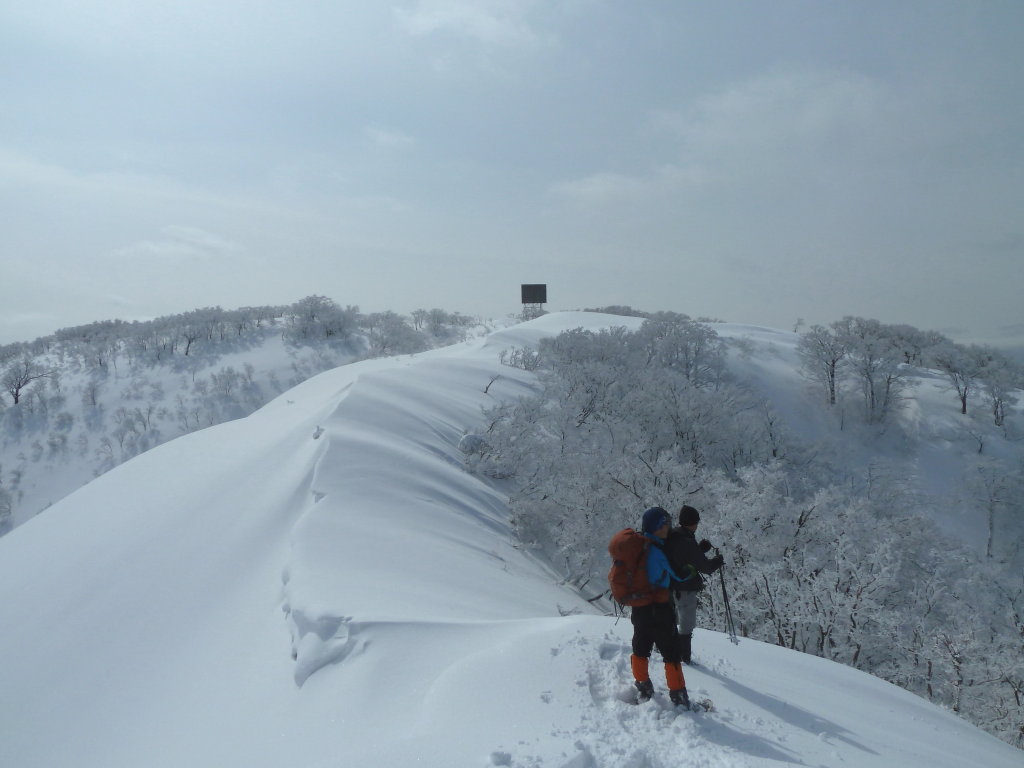 ブナ斜面を登りきり一旦痩せ尾根を渡って最後の急斜面に取り付く。稜線は土蔵岳と同じく高さのある雪庇が連なる。簡単に登れそうなところは見つけられず雪庇の一部をスコップで崩して通路をつくった。