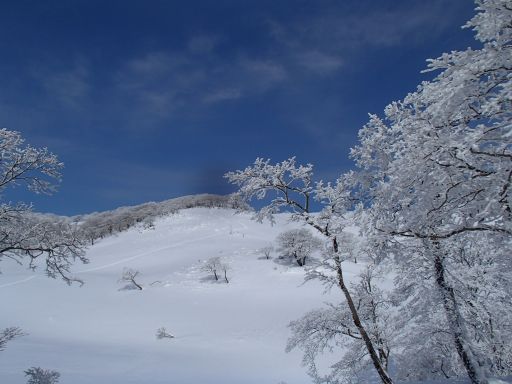 山頂からの下りは白く輝く霧氷を眺めながらスノーシューの足取りも軽く最高の気分である。