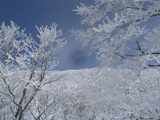 その後山頂に向かって見ると辺り一面の霧氷が白く輝いて綺麗である。(^◇^)