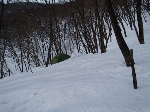 2つ目の鉄塔を越えて、ひと登りで白船峠に向かう分岐に出るが分岐にはテントが一張りあった。こんな下でテントを張るなんてよほど出発が遅かったのか・・・