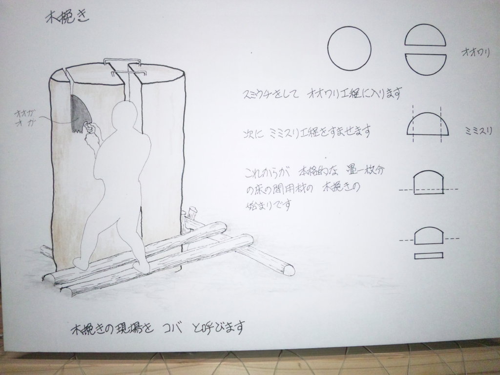 説明によると、丸太を切り出して板にする作業を「木挽き」という。その作業場をコバと呼ぶそうだ。