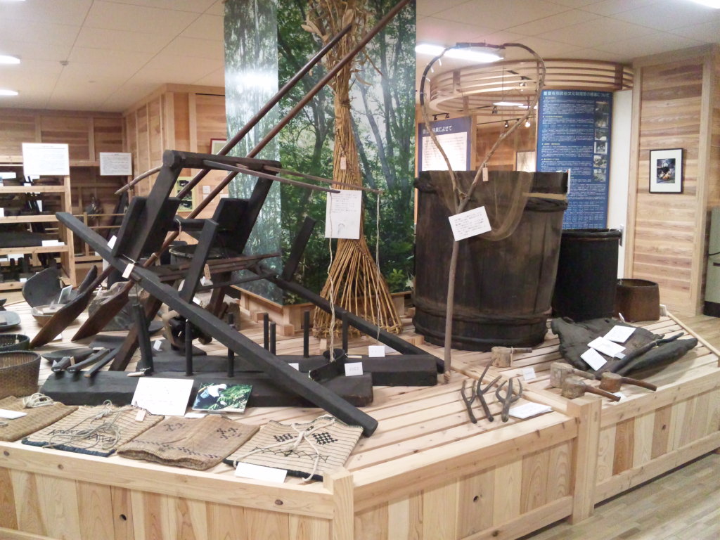 山仕事の道具やら機織りの機械、木の臼、篭、その他諸々。塚、櫨原、山手、本郷(徳山)、上開田(かいでん)、