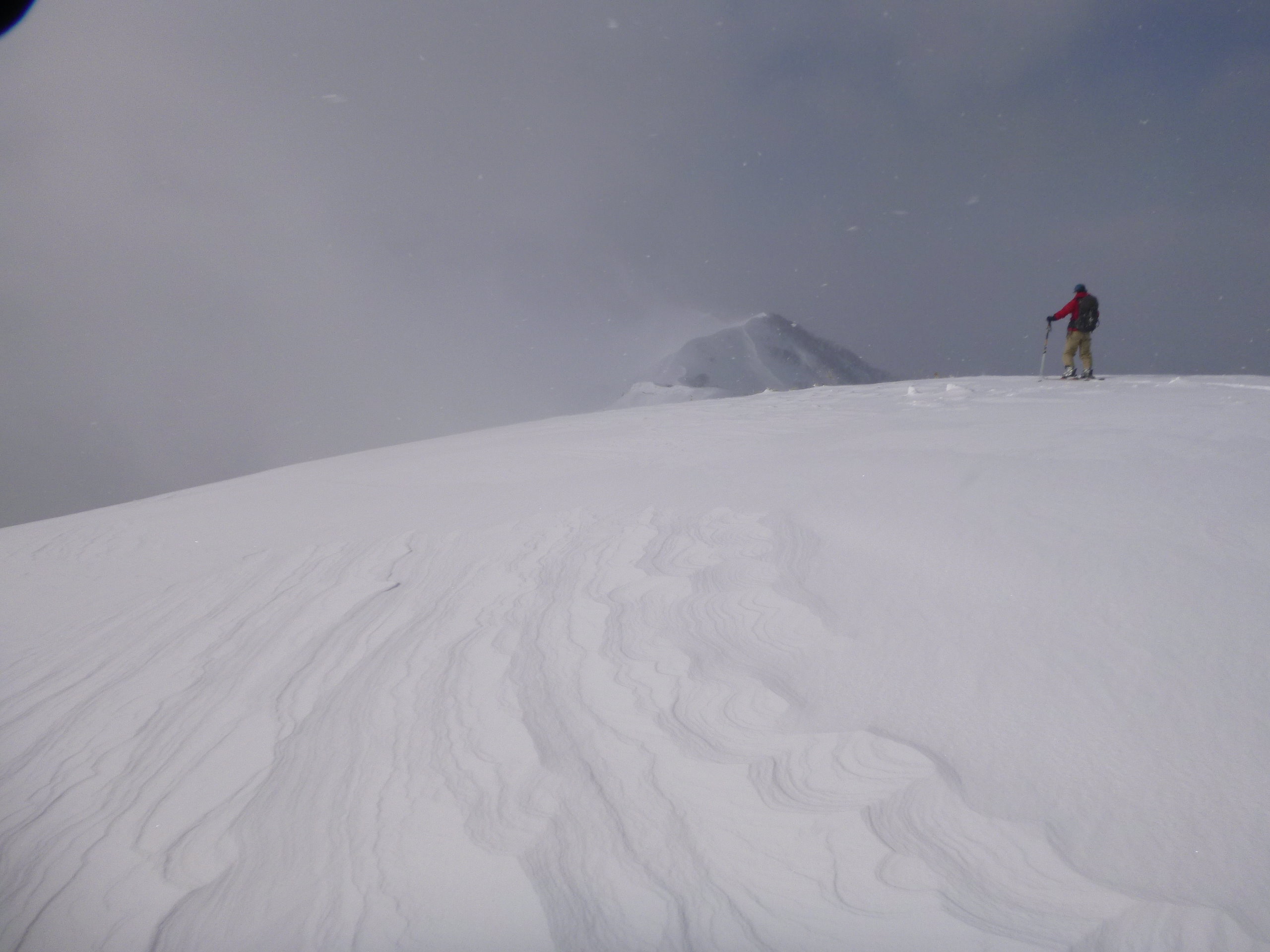 水後岳へ続く稜線は雪庇が発達して険しい姿だ。そこに強風が吹き付けて雪煙が尾を引いている。風が冷たくとりあえず大日谷に滑り込んで休憩しようという事になった。