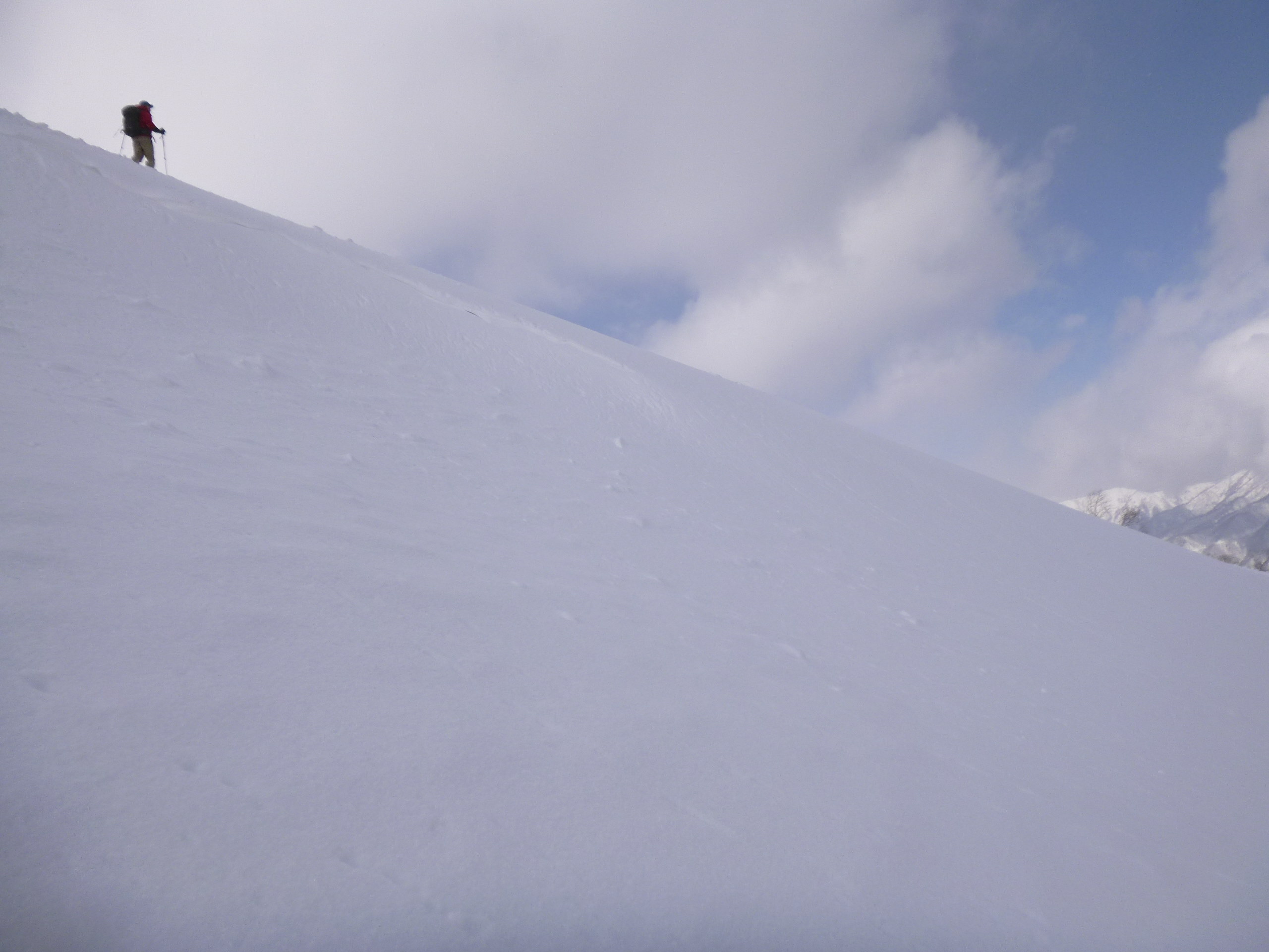 曇り空の下、光線がフラットで鞍部からの登り返し斜面の様子が分からない。勘で登っていったが上手い具合に稜線にあがる事ができた。