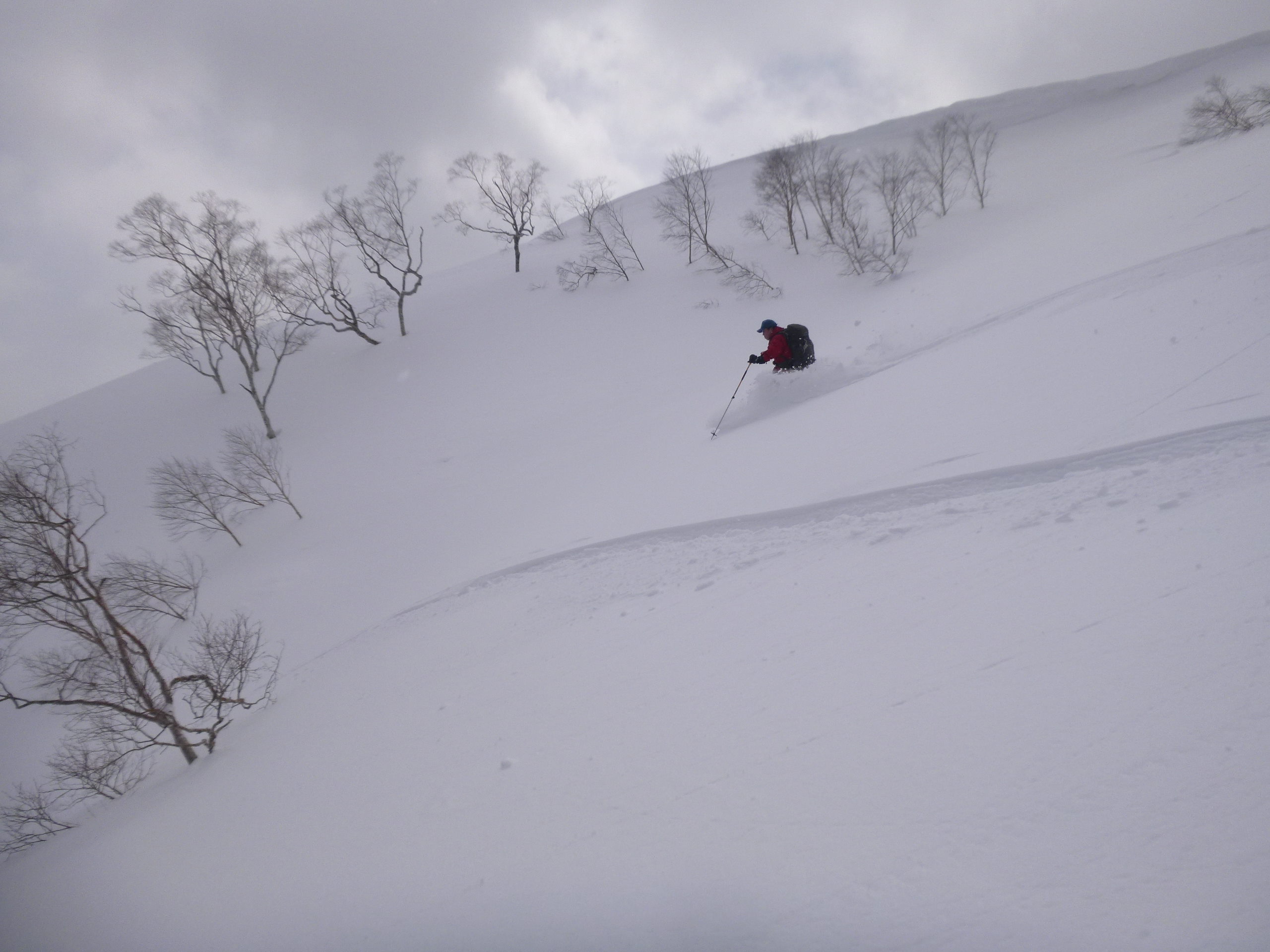 トップから直接ドロップするのは雪庇があり難しいので少し下ったところからエントリー。まだ誰も滑ってない無垢の雪面が谷に下っている。そこを今ちゃんがトップで気持ちよく落ちていく。続いてとっちゃん、そして僕。気持ちいい。一気にボトムまで滑り降りた。