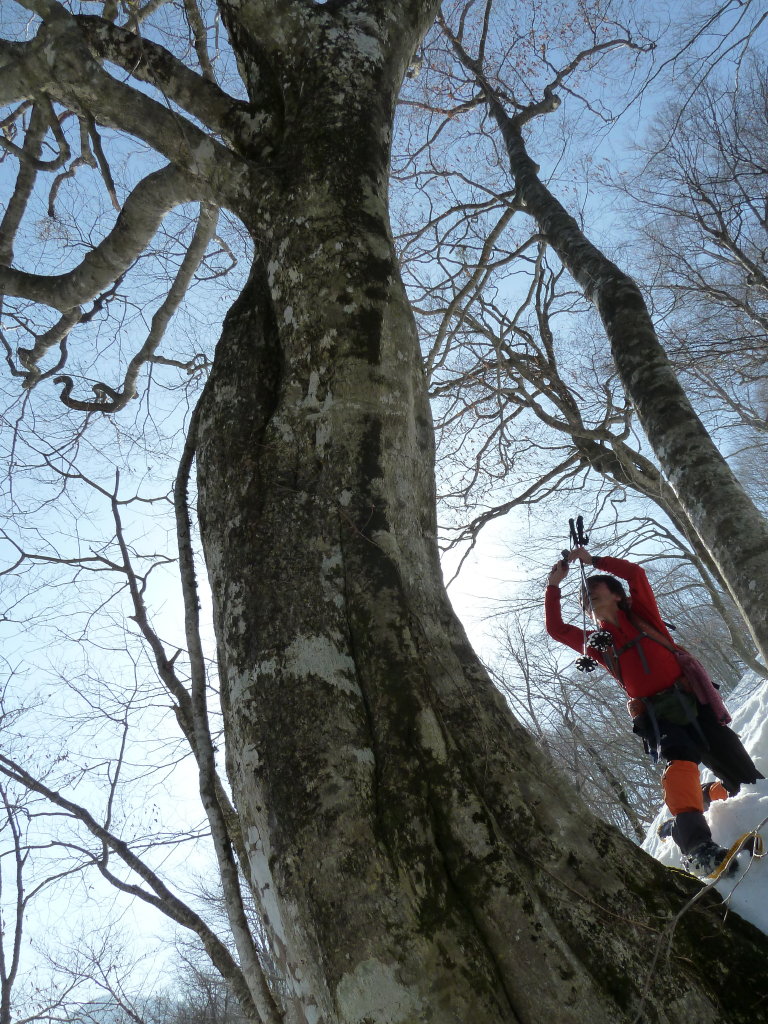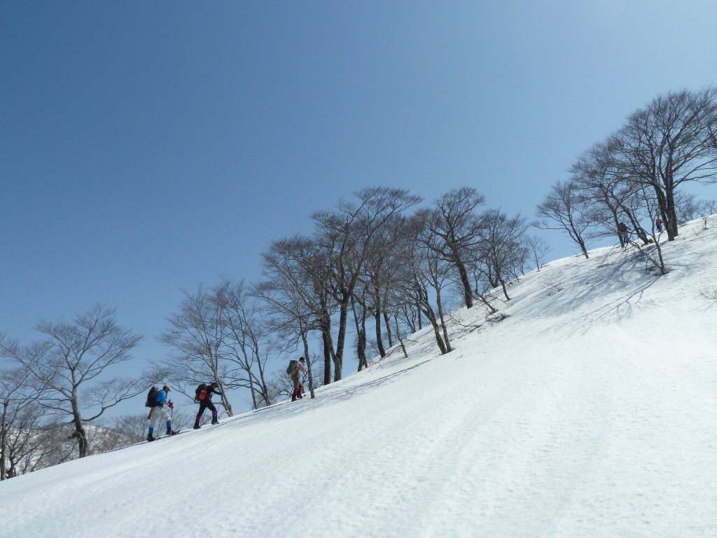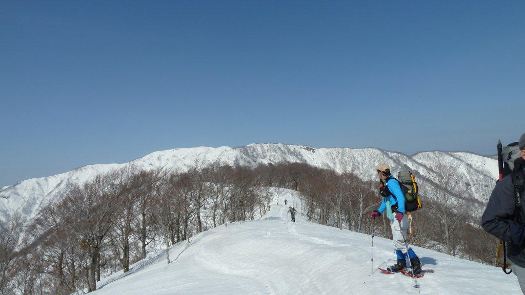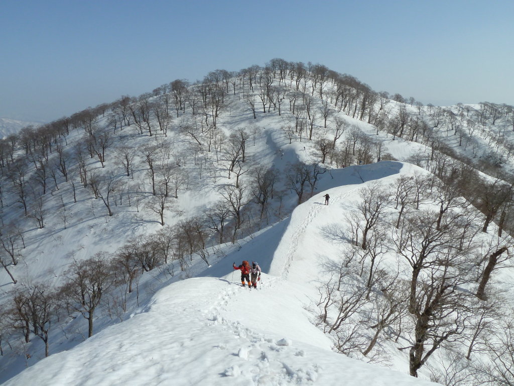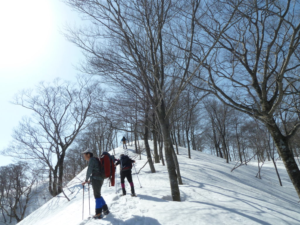 少し進むと快適な雪尾根歩行が始まる。ブナの大木が点在する尾根の右上には手倉山から上