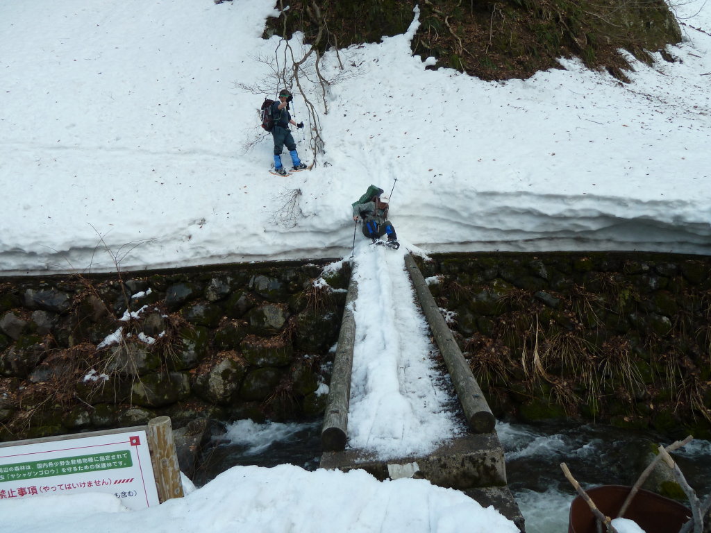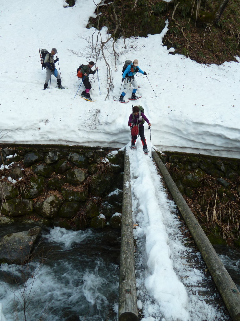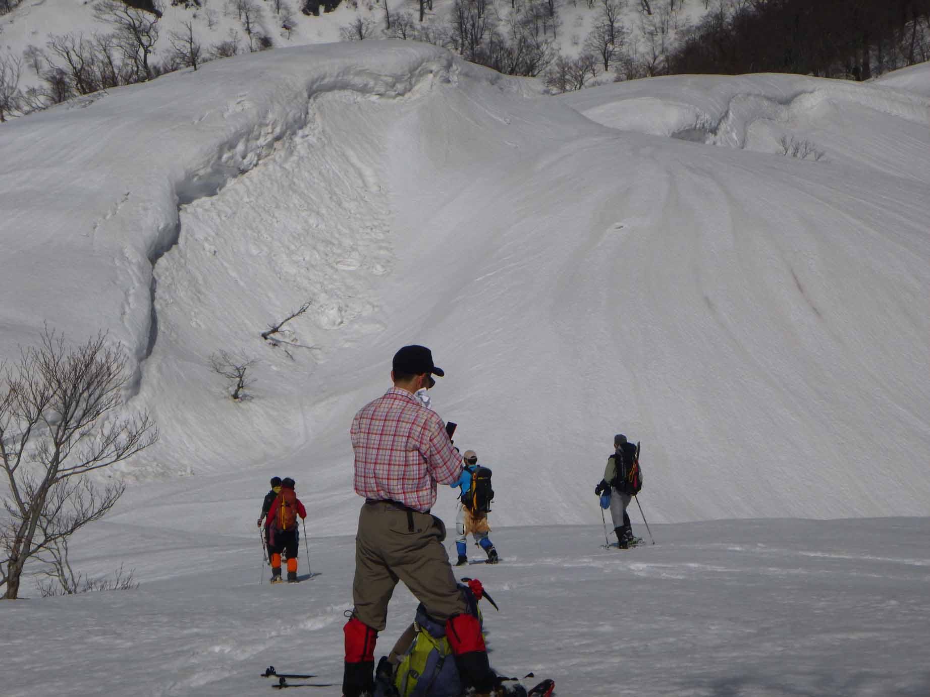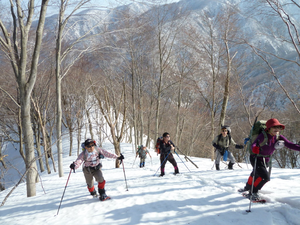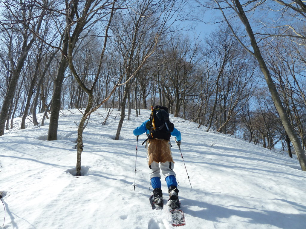 山頂から谷山への急斜面下りはスリルありました。尻滑りなんてストップできんようになるからゼッタイ禁止!雪がちょっと緩んでれば滑れそうですけどねえ。