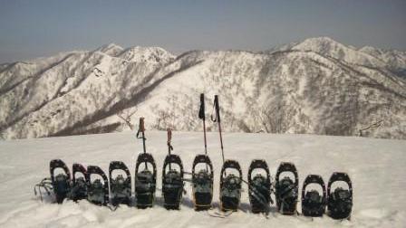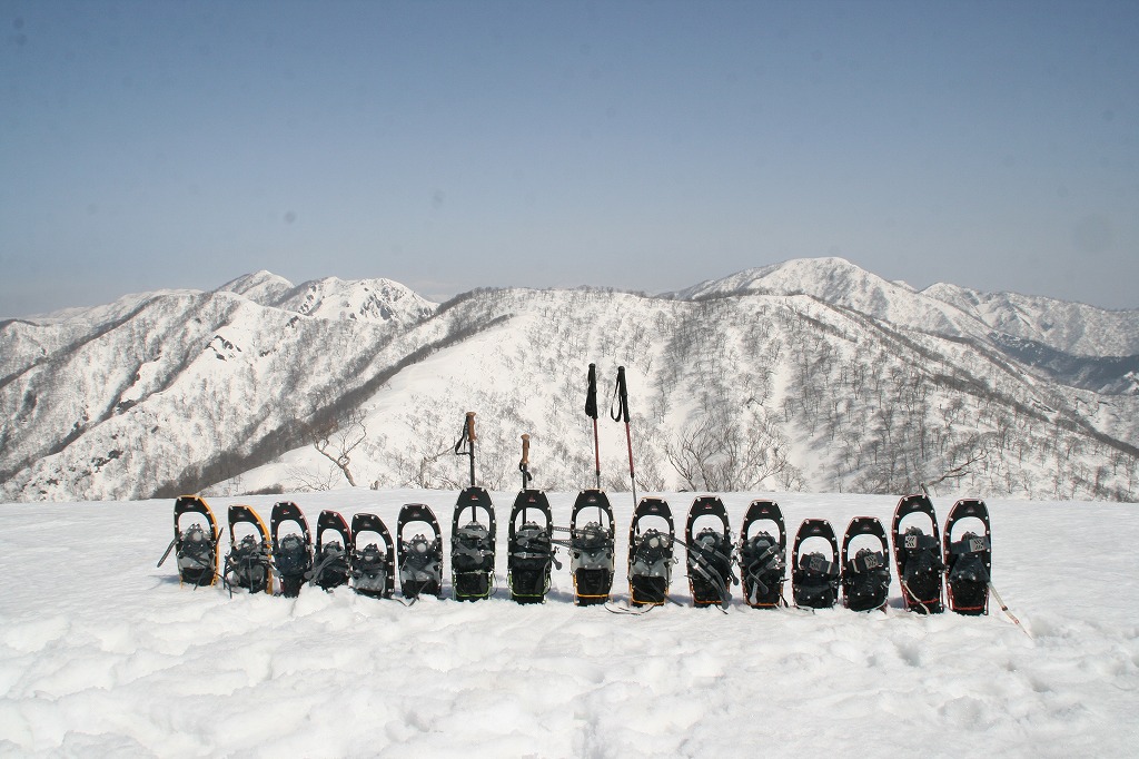 大御影でもやったスノーシューを一列に並べてクロオさんの一眼レフで記念撮影。