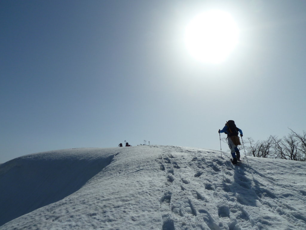 本当は尾根に乗らずに右横の斜面をシリセードで下りるのが正解です。