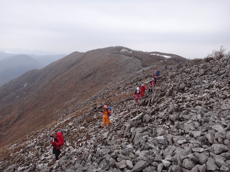 霊仙山西南尾根の急斜面に張り付く奈良のパーティーを、昨年から登山を始めて初心者の柚ッキーが目を丸くしてみている。まさに近江展望台と呼ばれるピークがニセ霊仙山の様相で聳え立つ。