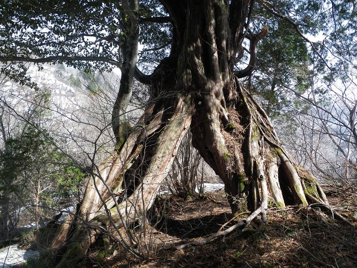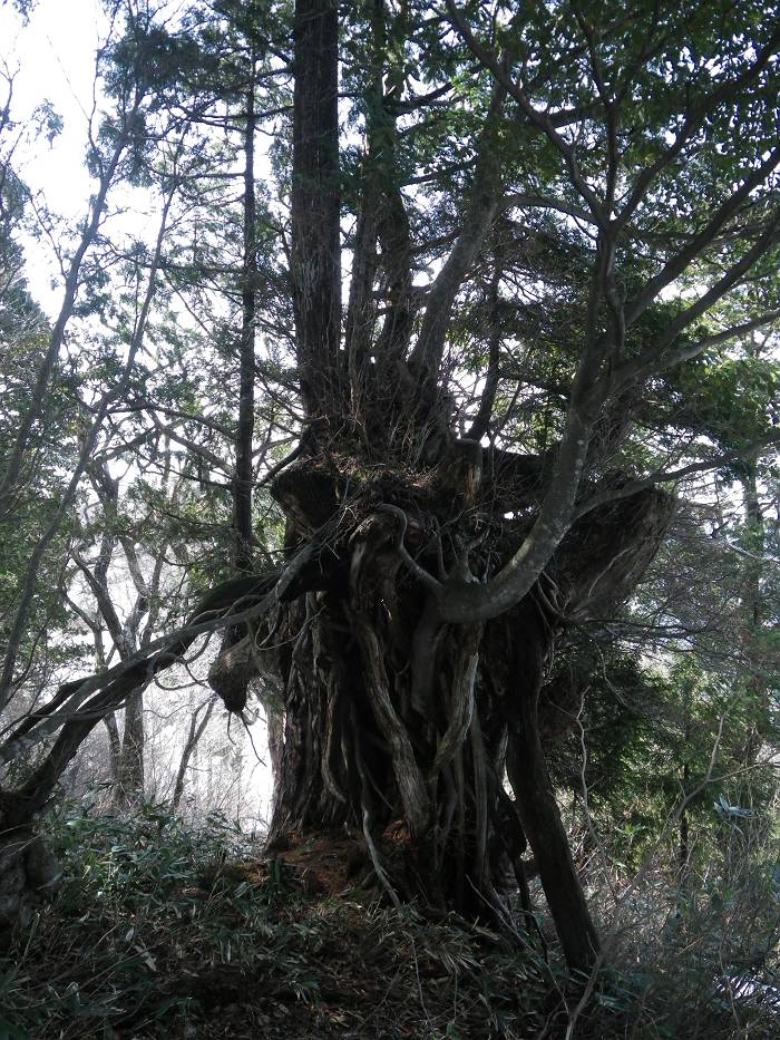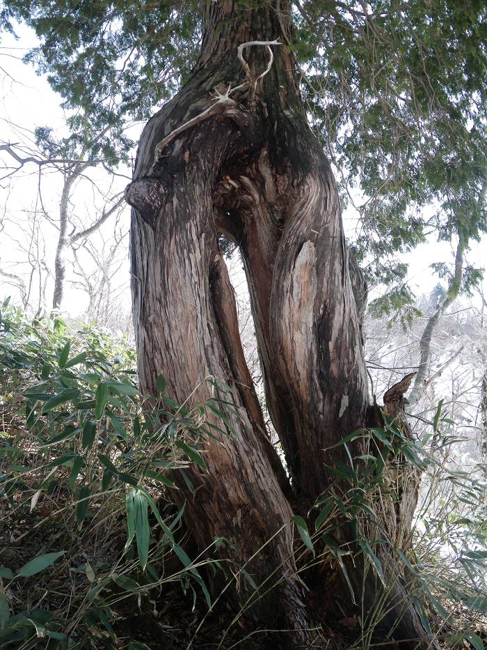 この稜線の見所は巨大な老桧だろう。蝿帽子嶺あたりでもそのデカさにたまげたが、ここも逞しい太さだ。その幹周は軽く4mは越えよう。