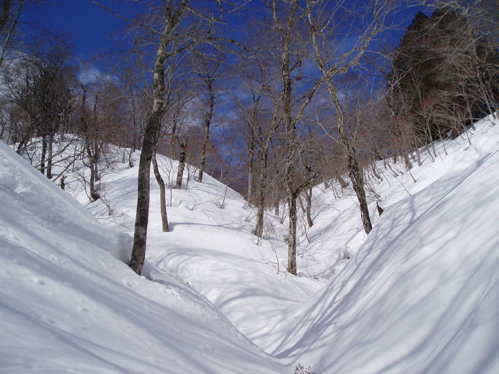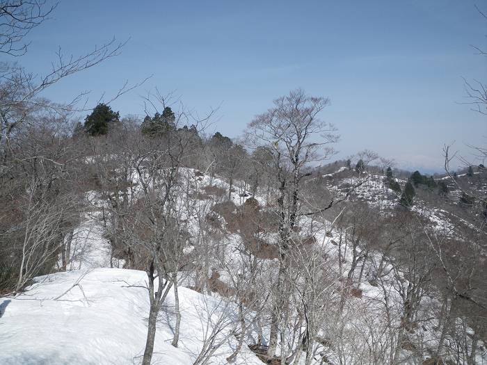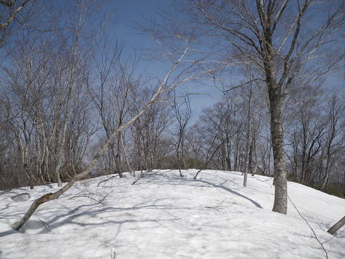 明神岳からの稜線を合わせると、ようやく切れ切れの雪が出てくる。だが、雪はあまりに中途半端過ぎて、全幅の信頼がおけない。いきなりズッポリくるし、積雪期に虐げられてきた灌木がびよんと立ち上がってくる。ヤブのムチでしばかれて嬉しいはずもなし。