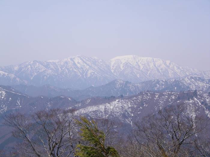 放棄されたモノレール沿いに登るとイワウチワの桃に慰められる。うるさい灌木を適当にあしらいながら高度を上げる。樹間の右に左に能郷白山やドウの天井が見えてくる。振り返ると、大白木山と高屋山が上大須ダムの背後を固めている。蕎麦粒から天狗へのスカイラインもすぐそれと知れた。となるとその左脇が雷倉だろうか。