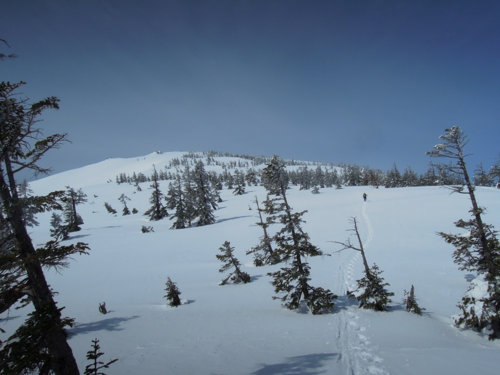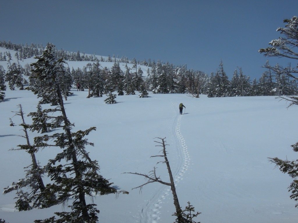 近くに感じてきた。前方を見ると5-6人のグループが一列でこちらに向かってくるのが分かる。そして広い斜面で遭遇。全員壺足であり先頭の若い女性がスノーシューはいいですね。こっちはもぐって大変という。うーん。この雪質だと確かにそうだろう。どうしてワカンでも持ってこなかったのだろうと逆に不思議。まあしかしこれだけいれば、若いし問題はなさそう。