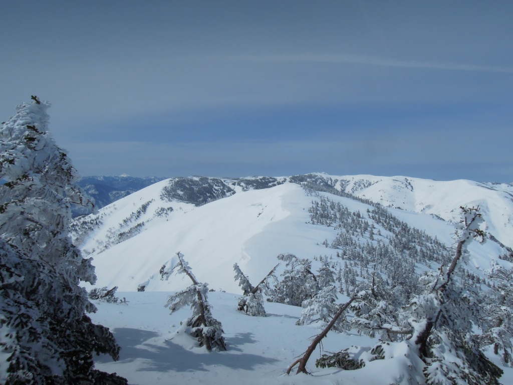 夏に来たときの景色を思い出しながら雪原を眺めるのもいいもんですねその後、三岩岳頂上着。ただ標識もない。すべて雪の下か。そこから前方を見ると平たい場所が見える。昨年藪を突っ切って飛び出した池塘のある場所だ。もちろん今はすべて雪の下。その先のピークまで来て休憩。ザックを下ろして先方を見遣る。