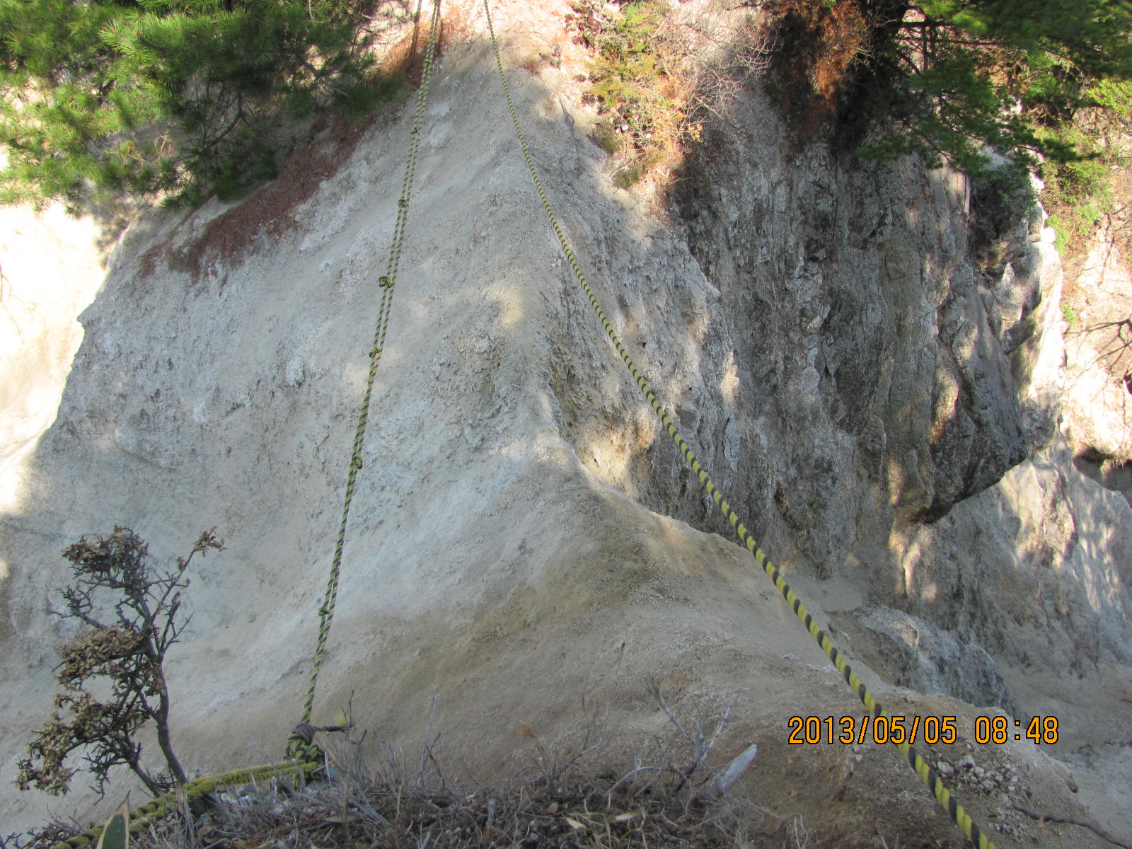 あそこを通られましたか。一応ロープは張ってあるので、カラビナとスリングで確保すれば滑落は免れますけど、下手をすると宙づりになりかねないので気休め程度ですね。