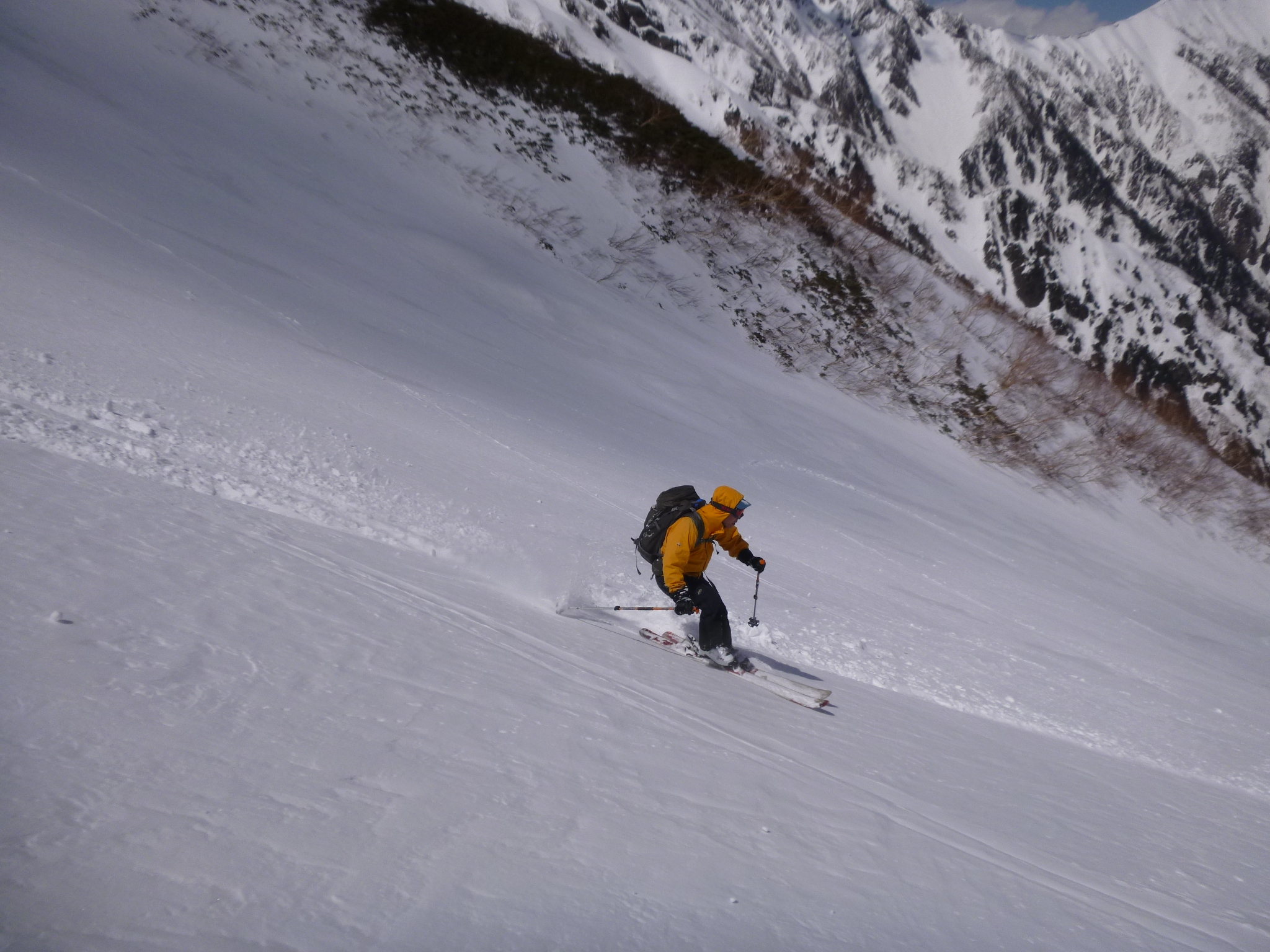 棚をトラバースして登ったところとは反対側に移動。こちらの方が雪付きがよさそうで滑りやすそうに見えた。しかしこれが誤りで斜度がかなりあり雪面も固めだ。滑落した時の事がふっと頭をよぎる。そうなると腰が引けて滑りも悪くなる。3ターンしたところでバランスを崩しこけた。やばい!しかしなんとかスキー板を雪面に押さえつけ滑落は避ける事ができた。