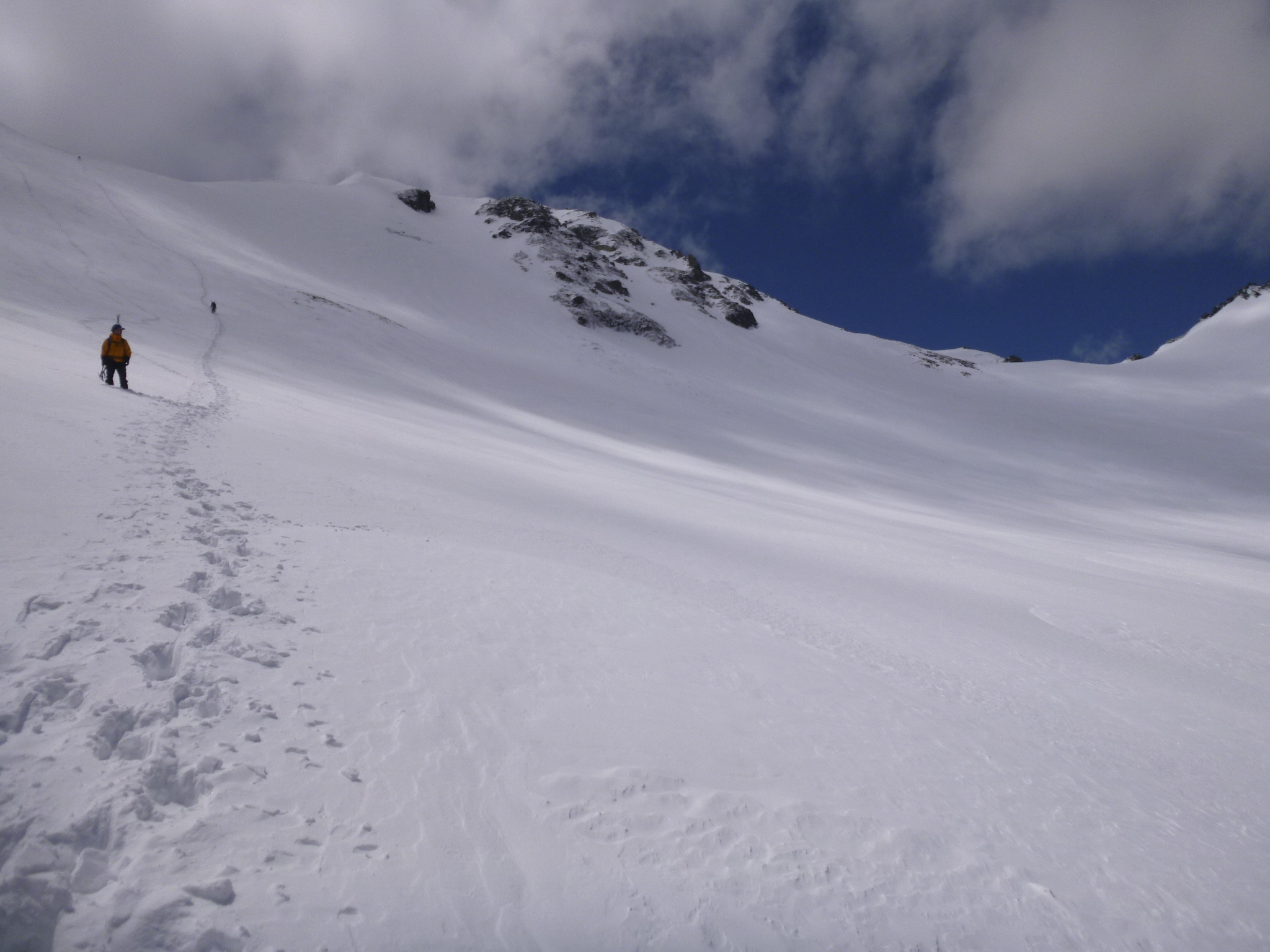 ヘルメットの主の話によると上部は斜度が立ちシールでは太刀打ちできなくなったとの事。先行のパーティは壷足での登高に切り替えたようだが苦労しているようだ。