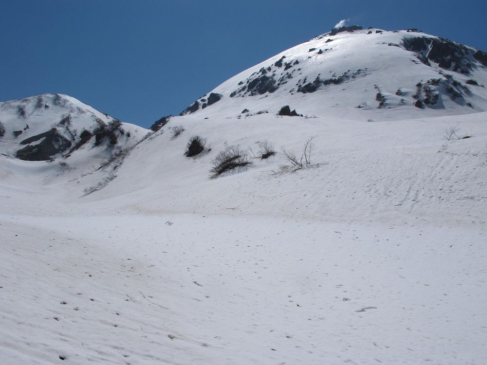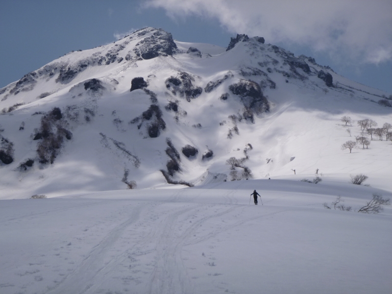 思わぬところを滑っているスキーヤーもいる。北面台地の西側の尾根筋を滑っているパーティや焼山火口から賽ノ河原に向けての沢筋を滑り降りてくるスキーヤー。とても真似できない。