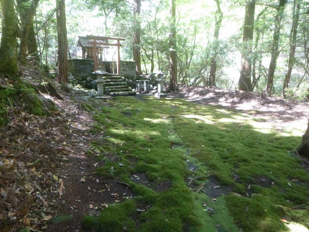 登山靴に履き替え,歩きやすい登山道を進むとすぐに日本コバの頂上に出た.途中,単独の男性とすれ違ったが,頂上には誰もいなかった.一人で頂上を独占する.1時間ほどのんびり休憩した後,歩きやすい登山道を通って下山する.登山口の近くには小さい社がまつってあり,そこの苔が昨日の雨に洗われてきれいだった.
