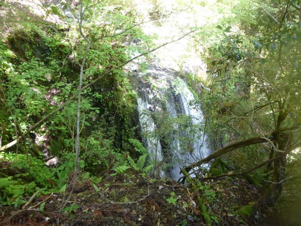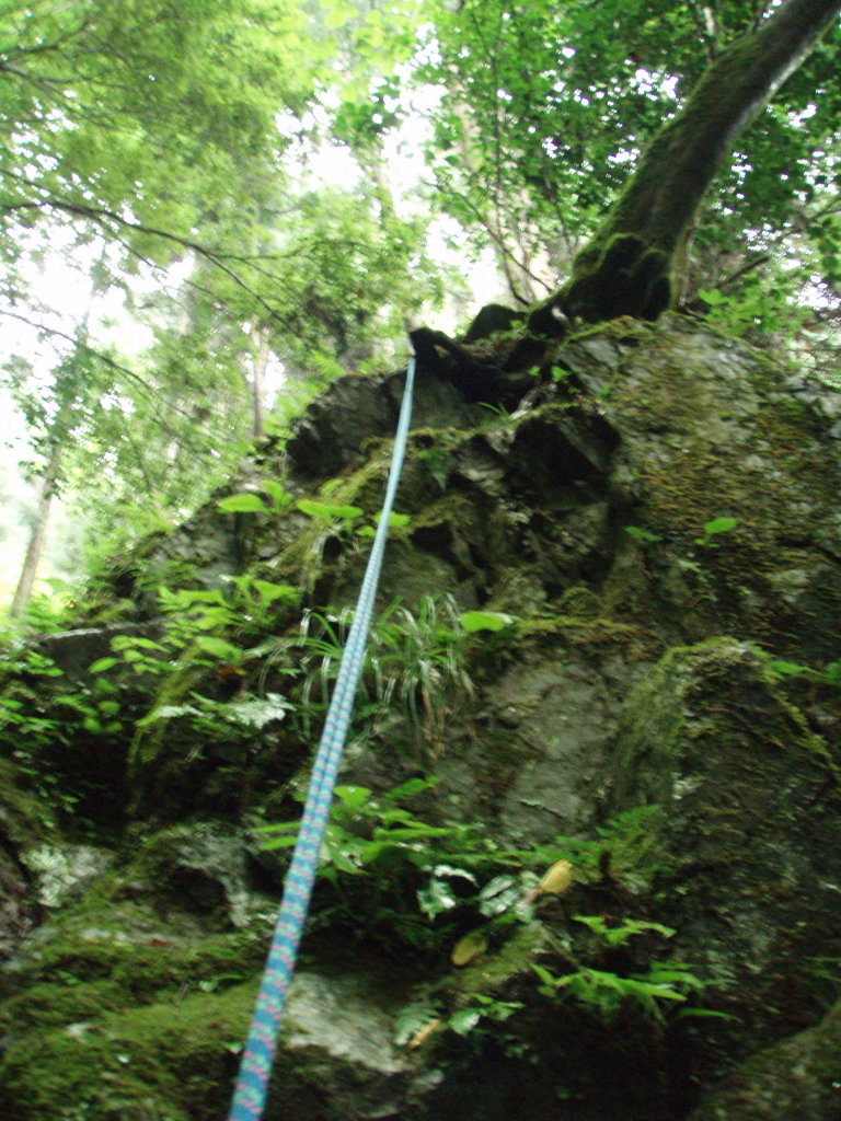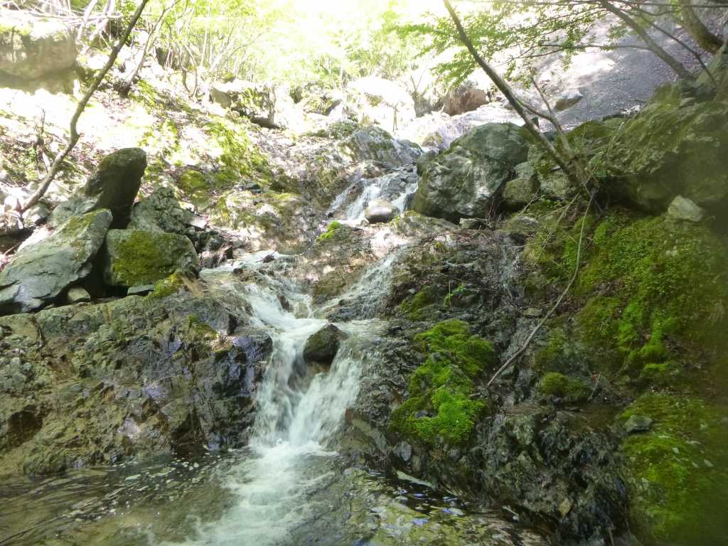 連瀑帯を抜けると,左岸から覆い被さるような石灰岩の壁を通り,一気に源流の雰囲気の所に出る.気持ちのいいところだ.左の枝谷を進んでいくと,すぐに登山道が沢を横切る場所に出たので,ここで遡行を終了する.2時間半ばかりの短い沢歩きだったが,滝登りを満喫させてもらって満足満足.