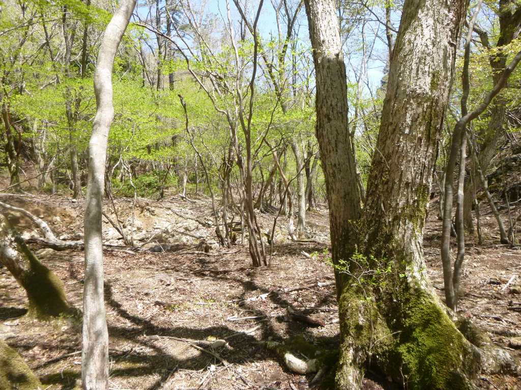 このあとは滝らしい滝もなく,新緑の広葉樹林を楽しみながらの沢歩きになる.時々滝は出てくるもののすべて斜滝で簡単に登ることができる.途中でイワナ釣りの初老の男性を見かける.水流の音でこちらの存在に気がついていないようなので,遠巻きにそっと通り抜ける.