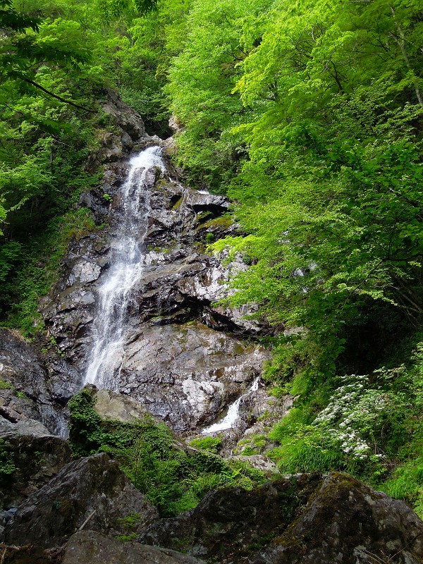 サスケ滝前の空間は、もう新緑に囲まれてしまっていて、自分も新緑に染まってしまいそうなほどの清々しさだ。大岩の上でしばし、その空気を吸った。