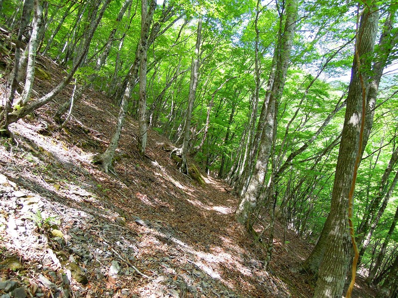 主稜コルに登ると、ブナの樹の下をさわやかな西風が吹き抜けた。