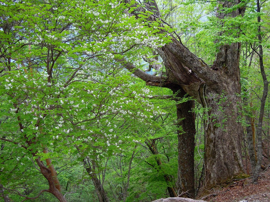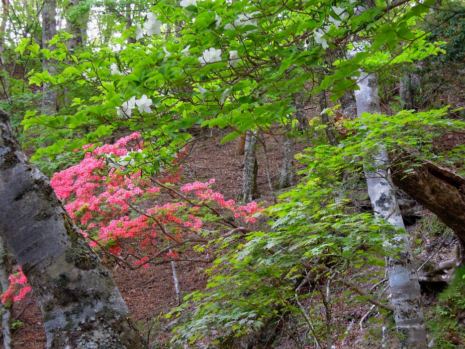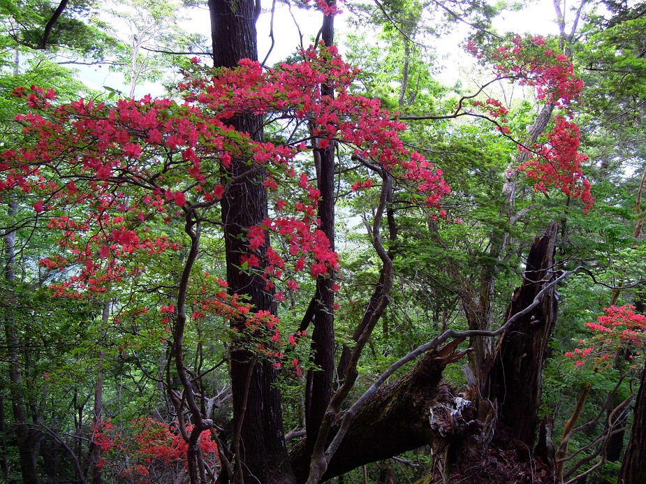 トラバースを越え行くと、その後はブナ、トガサワラなどの大木の尾根だ。ヤマツツジもよく咲いている。