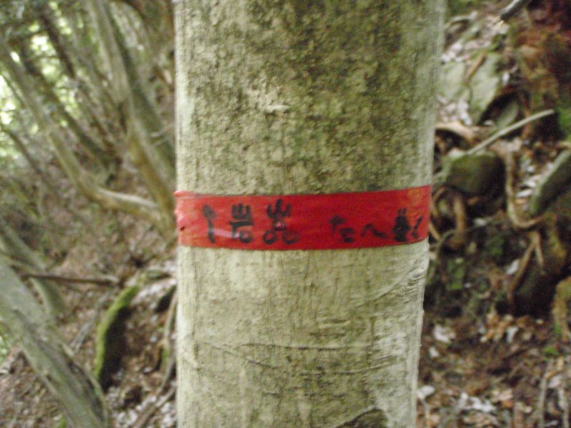 が、こんなに登ったろうか?と不安になり、一端登った尾根を降りて確認に行くがそれらしきものはない(10分ロス)。そして再び、こんなに登らなかったよなぁ、と思った矢先に赤テープのマーキングを見つけ、古道が尾根を横切っていた。