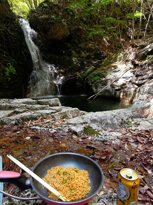 滝を巻き降り、新緑に包まれた釜に突き出た平な岩にシートを広げた。風は大滝滝口から谷を登るように吹き、蟲に煩わされることなく極楽な新緑ランチ場だ。