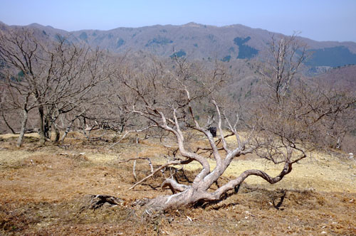 1206pの南尾根に登ると、太いブナにシロヤシオの古木が多い。このピークの東側は、ブナ・ミズナラ・ツガの大木が多くいい感じのところで、いつも休まずにはいられないところ。