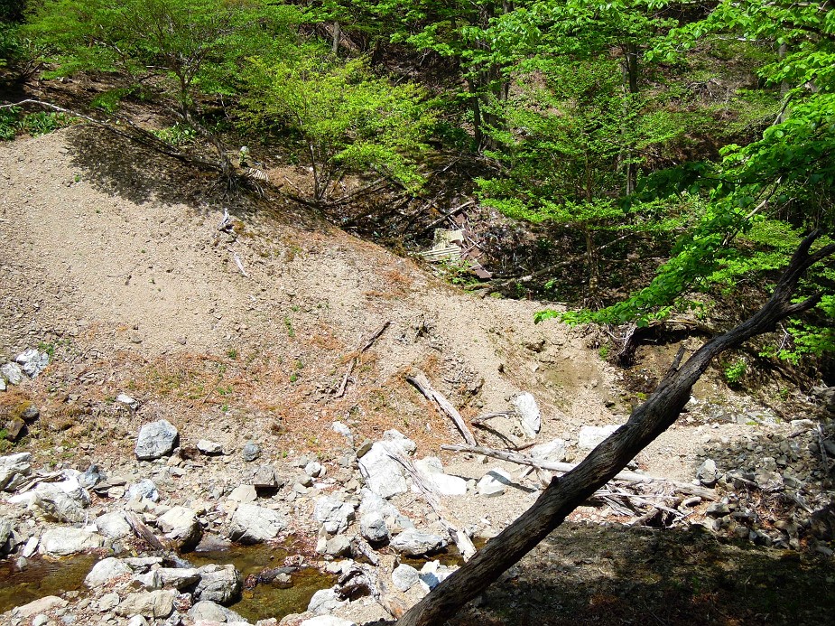 古道にのっても、谷筋は深く抉れ。道が落ちて。大規模な山ヌケが連続して道は消滅。いよいよグーは行かなくてもいいトコのようだな。