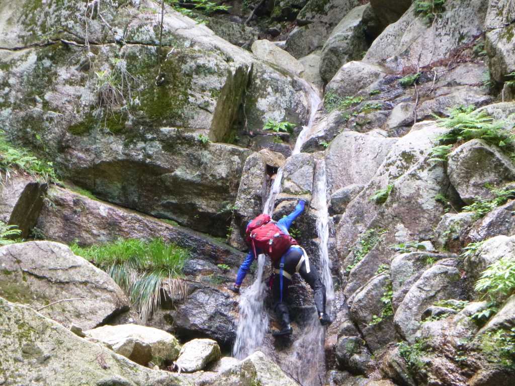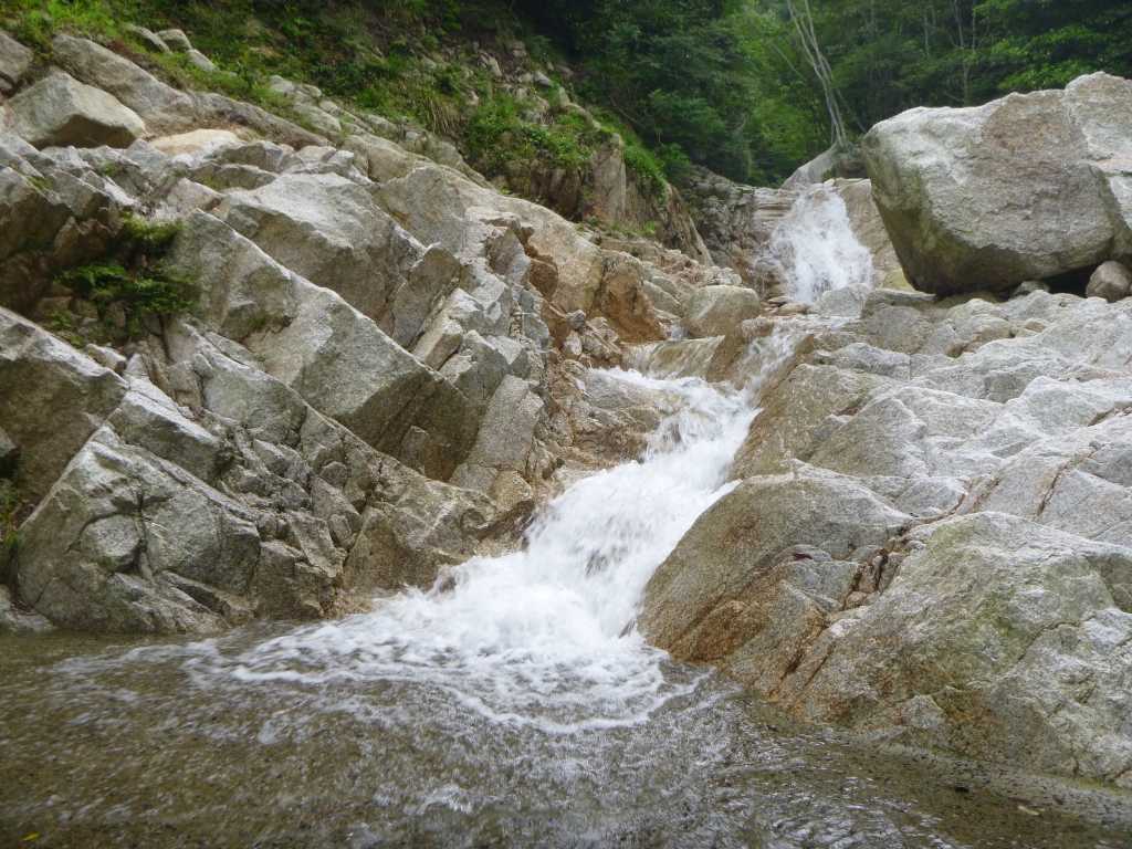 しばらく歩くと女郎滝に出る。たろーさんたちは流れの左側を登ったらしいが、我々は右側をへつって登攀する。女郎滝を越えると明るい花崗岩のナメ状の滝が続く。いずれも軽快に越えていく。この谷はとにかく明るくて、歩いていて楽しい。