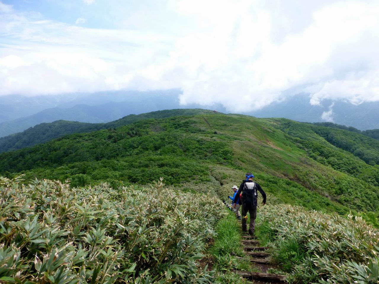ここからは、 所々ぬかるみもあるが、 木道が整備されていて歩きやすくなる。 コバイケイソウやニッコウキスゲの花が咲いている中を登山道が通っている。