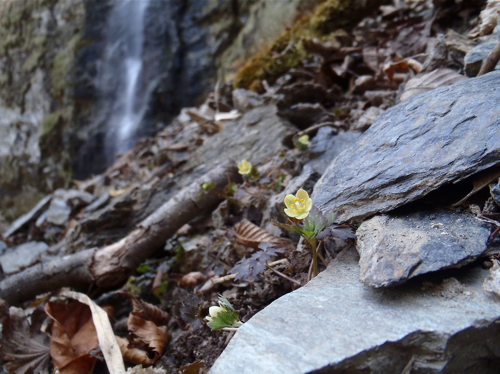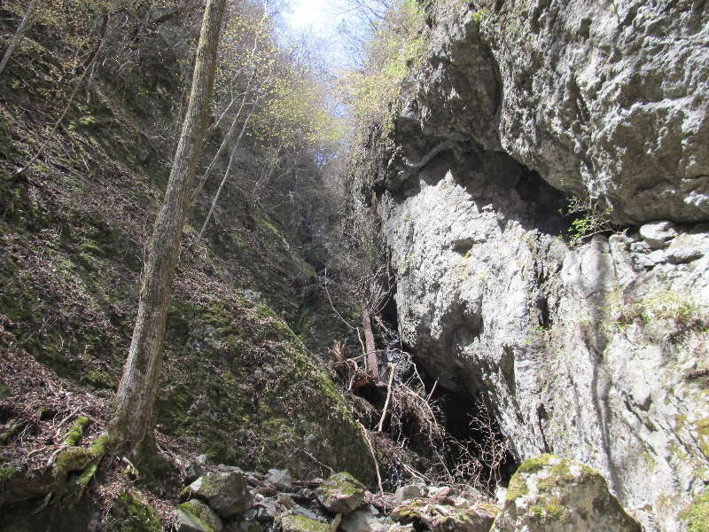 登り出すと小鹿の屍、岩ぐらから落ちたのだろうか?、すぐに行き詰まるだろうと思ったが楽に登っていける、双子のカツラの木がある先で谷は二又となり、本谷らしい左又に入ると大岩の下から水が湧き出ている上に出ると今まで無かった水流がそこにはあった。