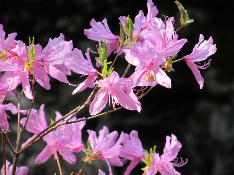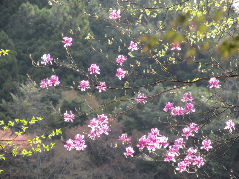 林道から見上げる岩場にはミツバツツジがピンクの花を咲かせている