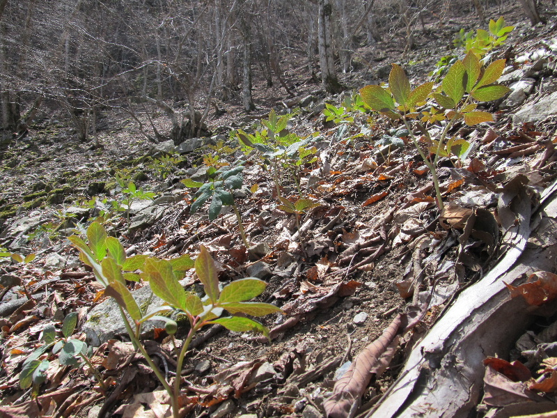 戻る途中にカツラの木の有るルンゼが気になった、岩が重なるルンゼだが明るく登って行けそうだある程度登って自然林帯をトラバースして帰ろう。