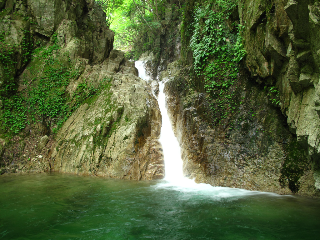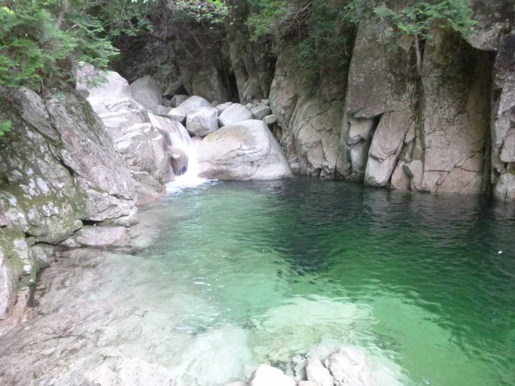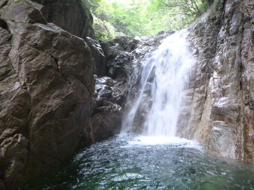痛みも取れたので歩き始めるとしばらくでいつも写真に出てくる大釜を持つ8m斜滝に出る。えっ、こんなに小さいの?写真で見ているともっとずっと大きい釜と滝に見えるのだが、目の前の滝はそれをミニチュア版にしたような感じだ。滝のとりつきまで泳いで10mもないのではないか。泳いで滝の左にとりつき、簡単に滝上に出る。次の8m滝も右岸を簡単に巻く。ここがこのコースの核心部のはずなんだけど、こんなに簡単に通過しちゃっていいの?あまりのあっけなさにわりばしさんと目を見合わせる。これって我々の沢力があがったということなんだろうか?