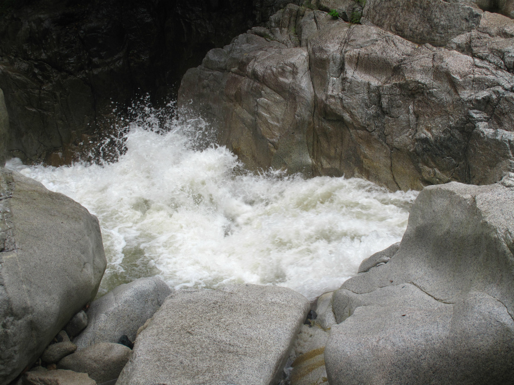 ここで昼食にする。昼食が終わったころに雷が鳴り、雨がぽつぽつ降り出した。これはあまりゆっくりもしていられないので、降り始めるとすぐに大粒の雨が降り出し、土砂降りになる。あっと言う間に流れは茶色に変わる。滝つぼをぷかぷか泳ぎながらのんびり下降するつもりだったんだけど、底が見えないので怖くて飛び込むことができない。