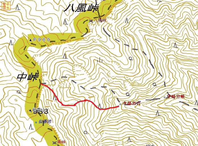 添付二万五千図の中峠登山道の破線は水晶谷の芯を通っている。ご存じの通り実際の登山道は赤線で示した尾根道である。両者の線を結ぶとまるでピーナッツ。つまり鏡で映したように正反対である。八風峠本道の破線だって間違っているのだから、そう拘ることもないかもしれないが、尾根と谷では全然違う。昔はここに道があった可能性を排除できない。それを検証することにした。