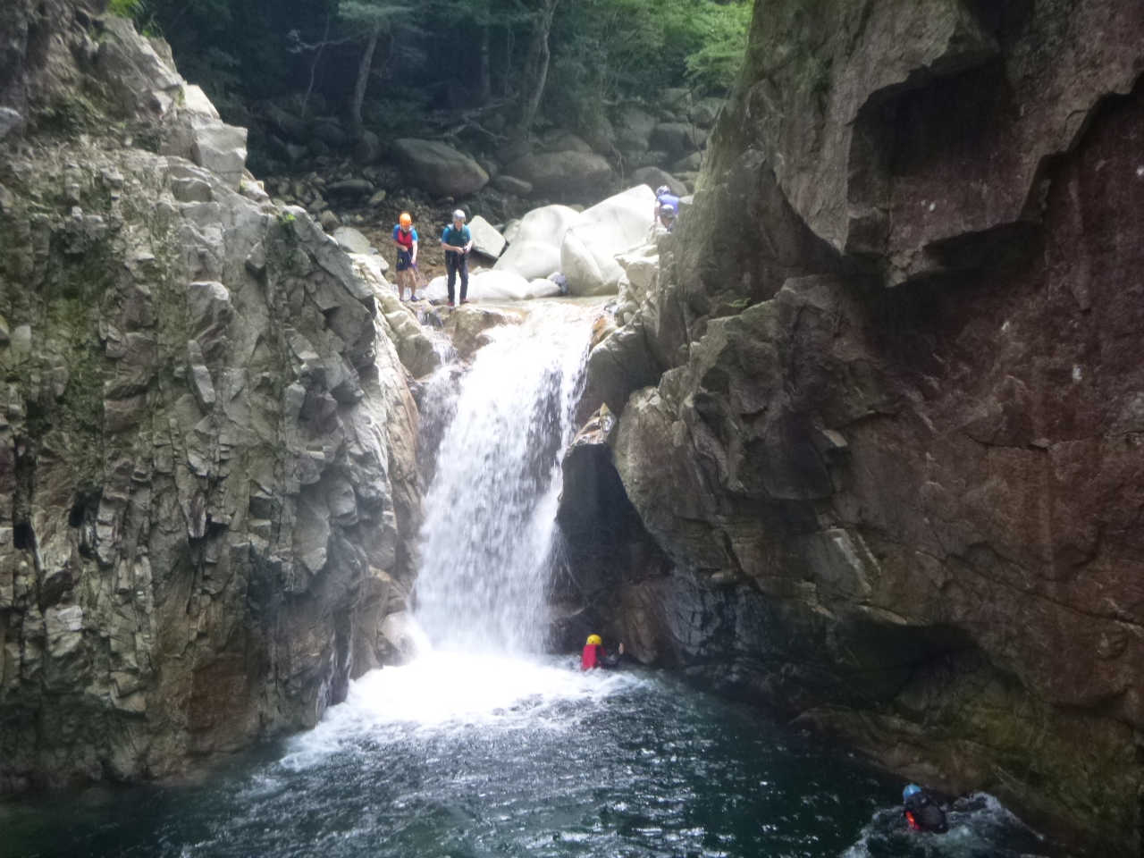 ウオータースライダーで遊んだあとは天狗滝だ。天狗滝までくるとさすがに人影が。一人が滝口に立って,ロープで5,6人のメンバーを引き上げようとしている。残りのメンバーは釜の左岸側で半身を水につかって待機中だ。水音でお互いの声が聞こえないようで,連携ができていない。泳げないおかさんに3種類の選択肢を提示する。上策はそのまま飛び込むこと,中策は滝下までおりて釜を泳ぐこと,下策は巻き道で降りること。おかさんは何の迷いもなく下策を選んだ。