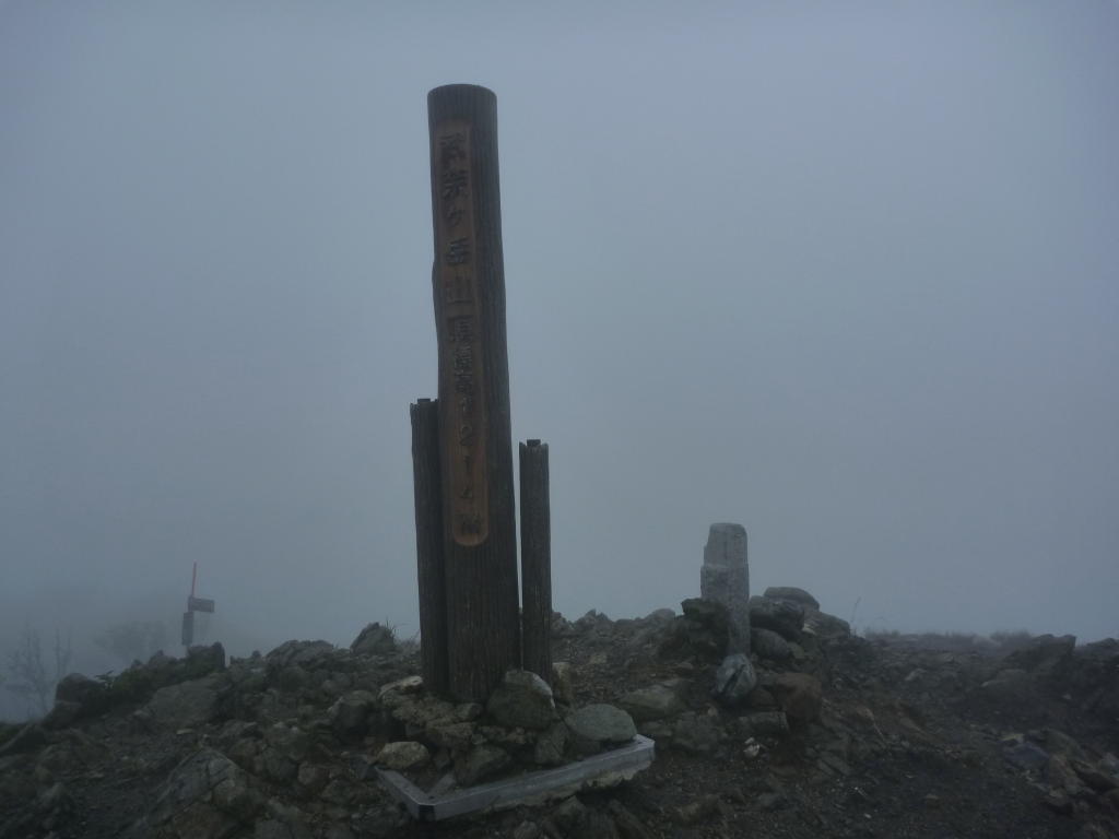 幸運にもいつしか雨は上がり、高速道路のような武奈ヶ岳の北尾根に飛び出す。何も見えない。視程は20~30mだろうか。武奈ヶ岳の山頂はもう指呼の間である。下山路の細川尾根の分岐を確認しながら進めば、ガスの中から山頂の標識が浮かび上がった。いつもなら大賑わいのはずの比良最高峰も、さすがに今日の天気では誰もいない。