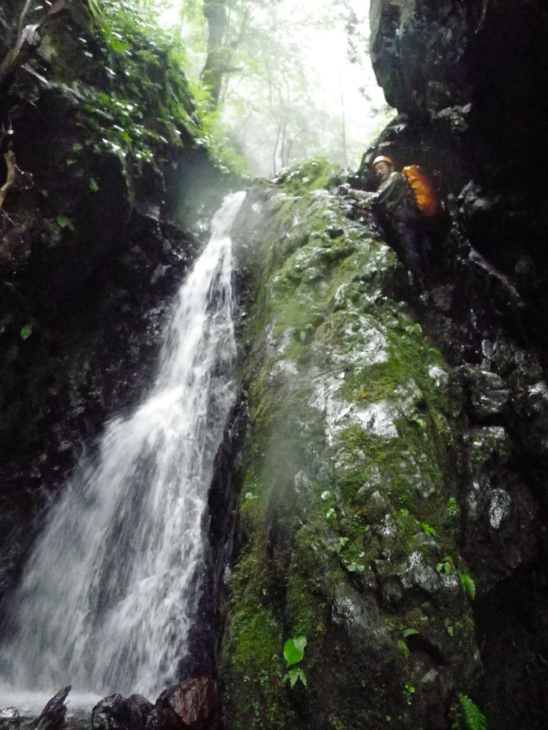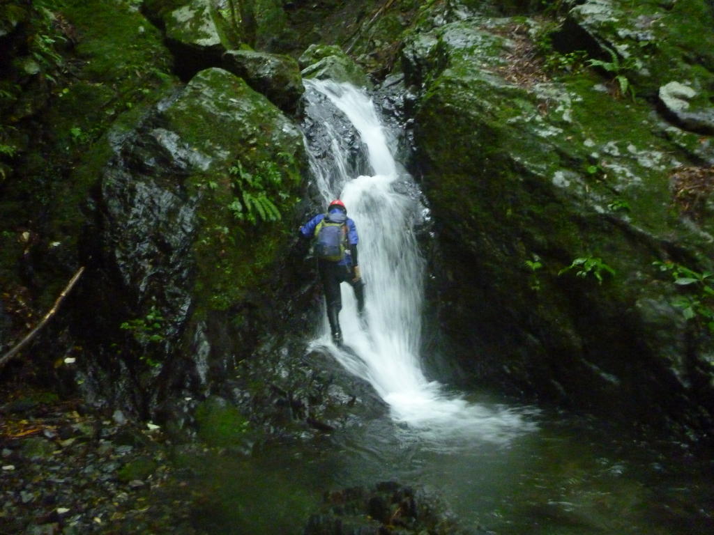 大岩が谷を塞ぐ5m滝を越え、5mクラスを3本直登して真ん中に馬の背のような岩が張り出した6m滝。岩の右側のガリーを上がると最後はハングしているので、馬の背から滝身の方へ乗り出して上がらないといけないのだが、ホールドが非常に乏しい。ここは残置スリングにセルフビレイを取ってA0で上がるが、左手と左足のホールドは微妙だ。なんとか這い上がって、スリングでふ~さんを引っ張り上げた。実に面白い。