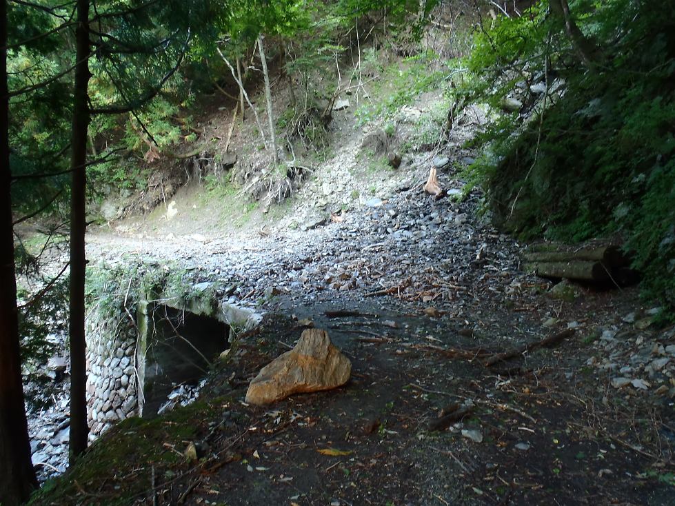 林道分岐の先、橋を渡った広場にはテン泊していた。松の倒木の横をすり抜けた先で沢から土砂の押し出し。