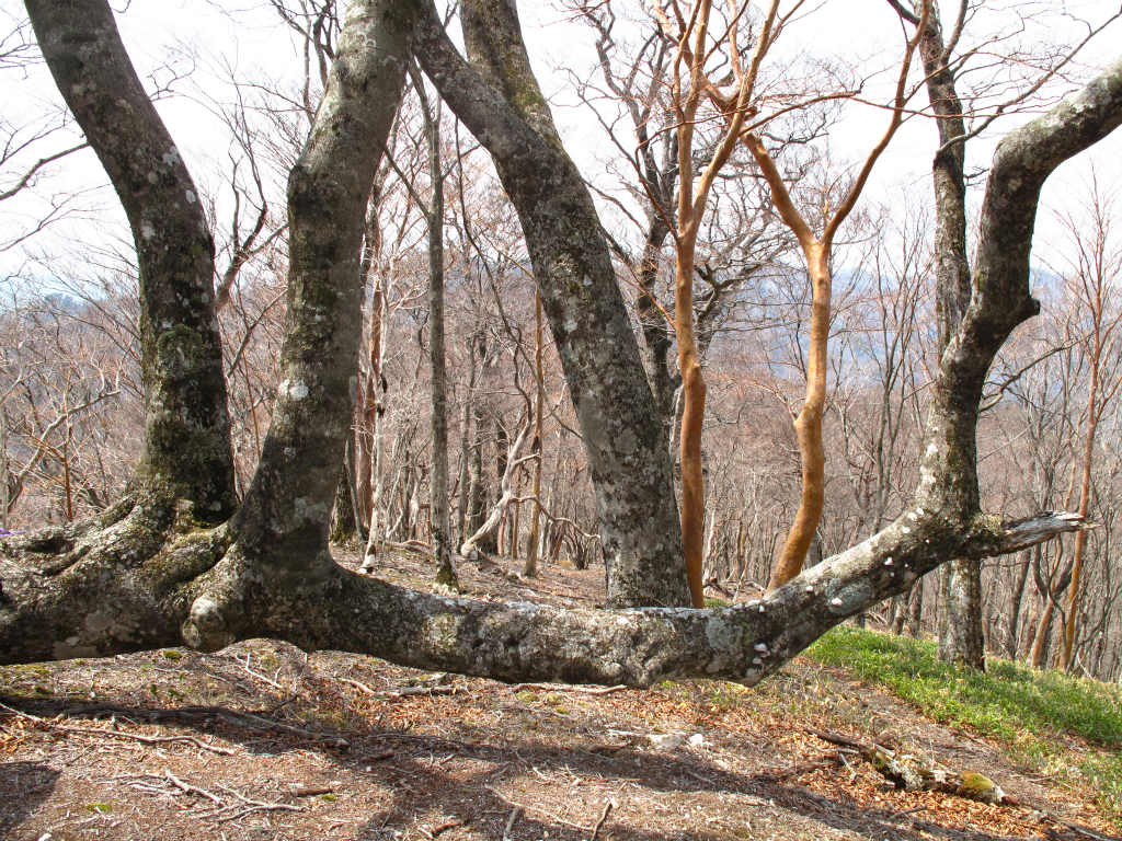 そして、コルや支尾根が取り付く地点などには杣道の目印となるミズナラやモミノキの大木が何本も残されている。よく考えて見るとこの尾根は木地師集落の蓮や江馬小屋に向かって伸びている。木地師が山に入り木を調達するのにこの尾根を使わないはずはない。2万五千の地図に書かれている道は、木地師が使った杣道なのだろう。これだけのミズナラやモミノキの大木が残されている事からもわかる。