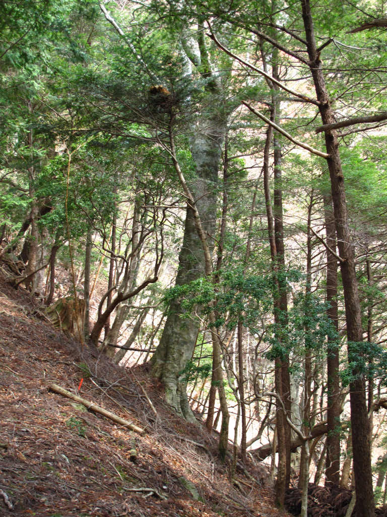 P1024を過ぎ急な植林地を下る。しばらく下るとモミノキの大木がある。斜面が落ちた対岸にもモミノキがある。2万五千の地図のルートはP1024手前からトラバースしてここにつながっていたんだ。そして谷筋に沿って下っていくように書かれている。谷筋を気にしながら植林を下りていく。すると植林の谷筋に杣道の目印のモミノキが残されている。植林の上部の別の場所に結局3本の目印のモミノキが残されていた。森林開発が叫ばれ、植林が全盛を向かえた時代に、人はどういった思いでモミノキの大木をわざわざ残したのか。思いはめぐる・・・