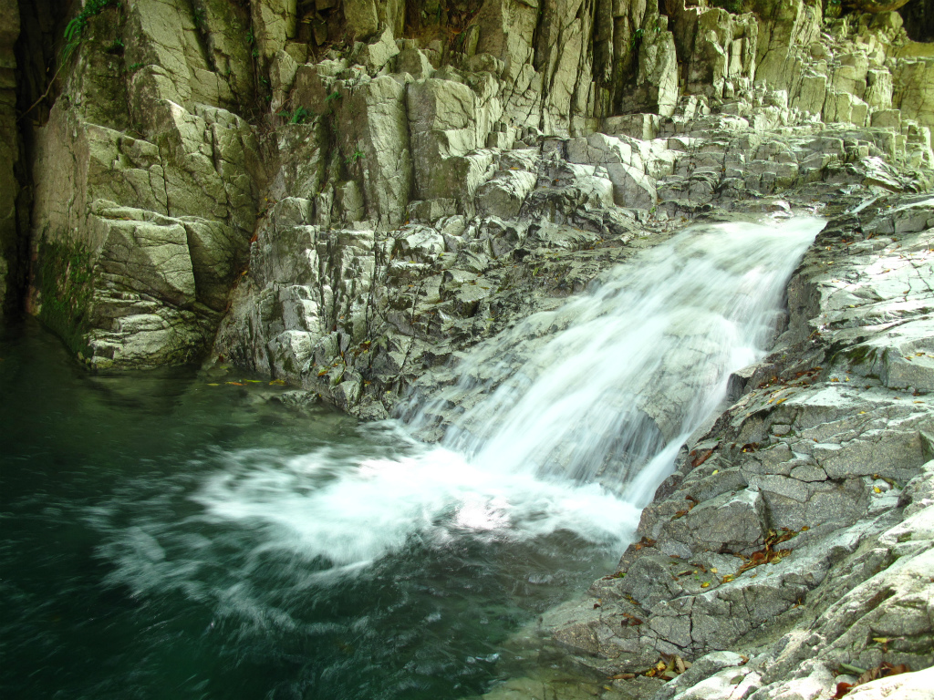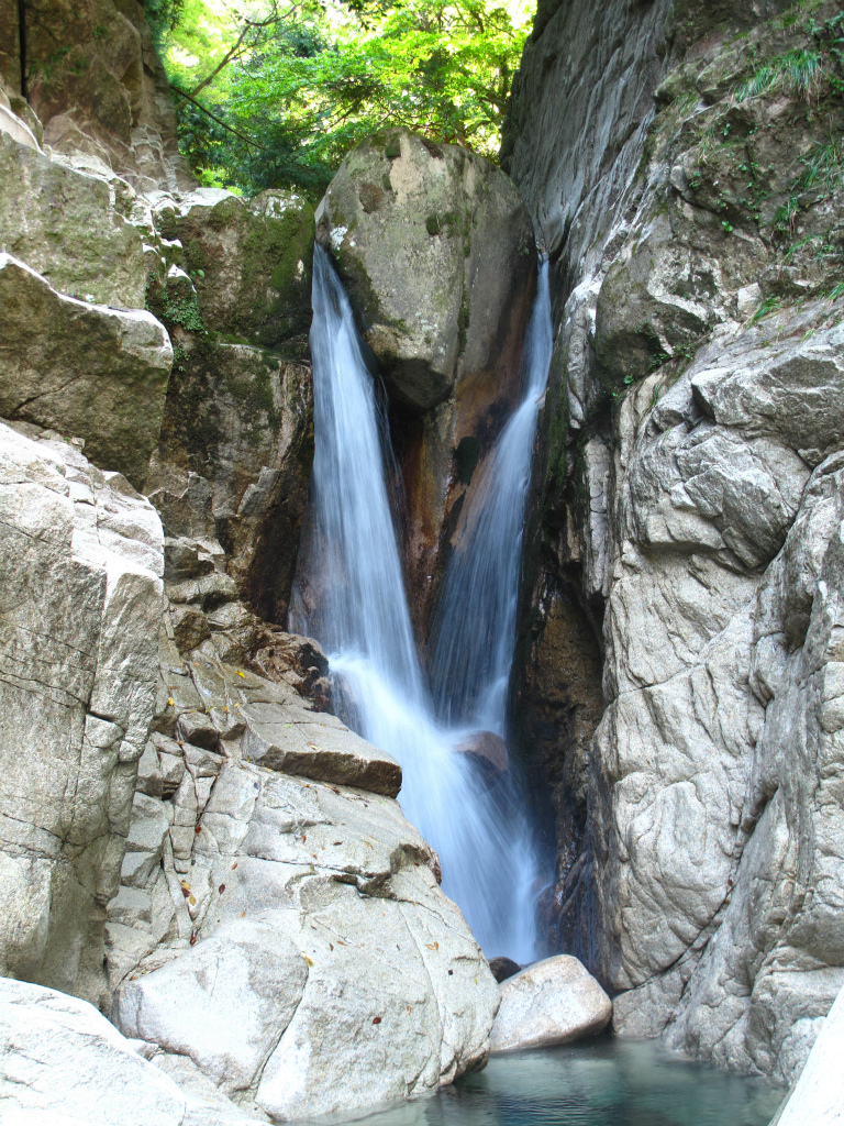 大釜を持つ4mの斜瀑は右の岩棚からこえる。荒々しい花崗岩の岩棚と滝のコントラストが際立って見える滝だ。